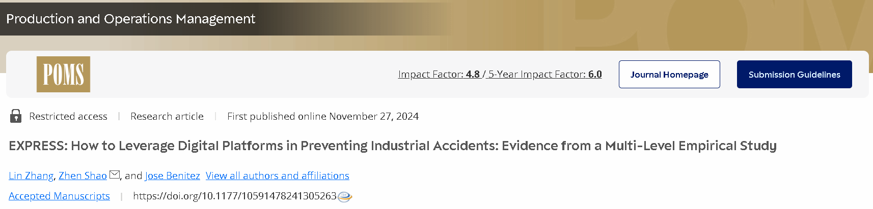 近日,管理学院副教授张林与合作者的研究成果“How to Leverage Digital Platforms in Preventing Industrial Accidents: Evidence from a Multi-Level Empirical Study”在《Production and Operations Management》期刊上在线刊登,张林为论文第一作者。《Production and Operations Management》是国际生产与运作管理协会会刊,为生产与运作管理领域顶级期刊,是美国University of Texas at Dallas所选出的商学院最顶尖24种学术期刊(简称UTD24)之一。