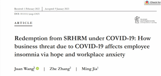 近日,管理学院副教授王娟与合作者的研究成果“Redemption from SRHRM under COVID-19: How business threat due to COVID-19 affects employee insomnia via hope and workplace anxiety”在《Journal of Occupational and Organizational Psychology》期刊上正式发表。《Journal of Occupational and Organizational Psychology》是组织行为领域国际顶级期刊,是ABS四星级期刊。这也是学院教师首次在这一级别的组织行为与人力资源管理类国际高水平期刊上发表研究成果。